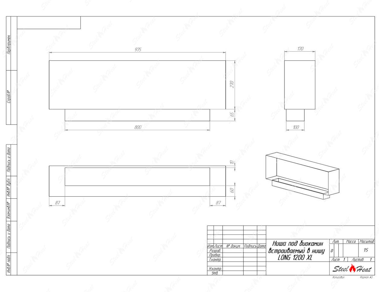 Встраиваемый Биокамин SteelHeat LONG-D 1200 XL предназначен для встраивания в глухие ниши из гипсокартона, кирпича, пеноблоков, бетона.