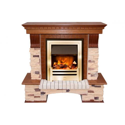 Каминокомплект «Pierre Luxe» оборудован современным очагом «Opti-Myst Cavendish» и выполнен в стиле деревенских домов старинной Европы. Раньше такие камины изготавливали из натурального камня, что усложняло процесс их монтажа. Портал же рассматриваемого каминокомплекта выполнен из более легкого МДФ. Боковые его грани и основание облицованы материалом, имитирующим натуральный сланец, как по цвету, так и по фактуре. Декоративные элементы выполнены из МДФ и покрыты натуральным шпоном под цвет темного дуба.